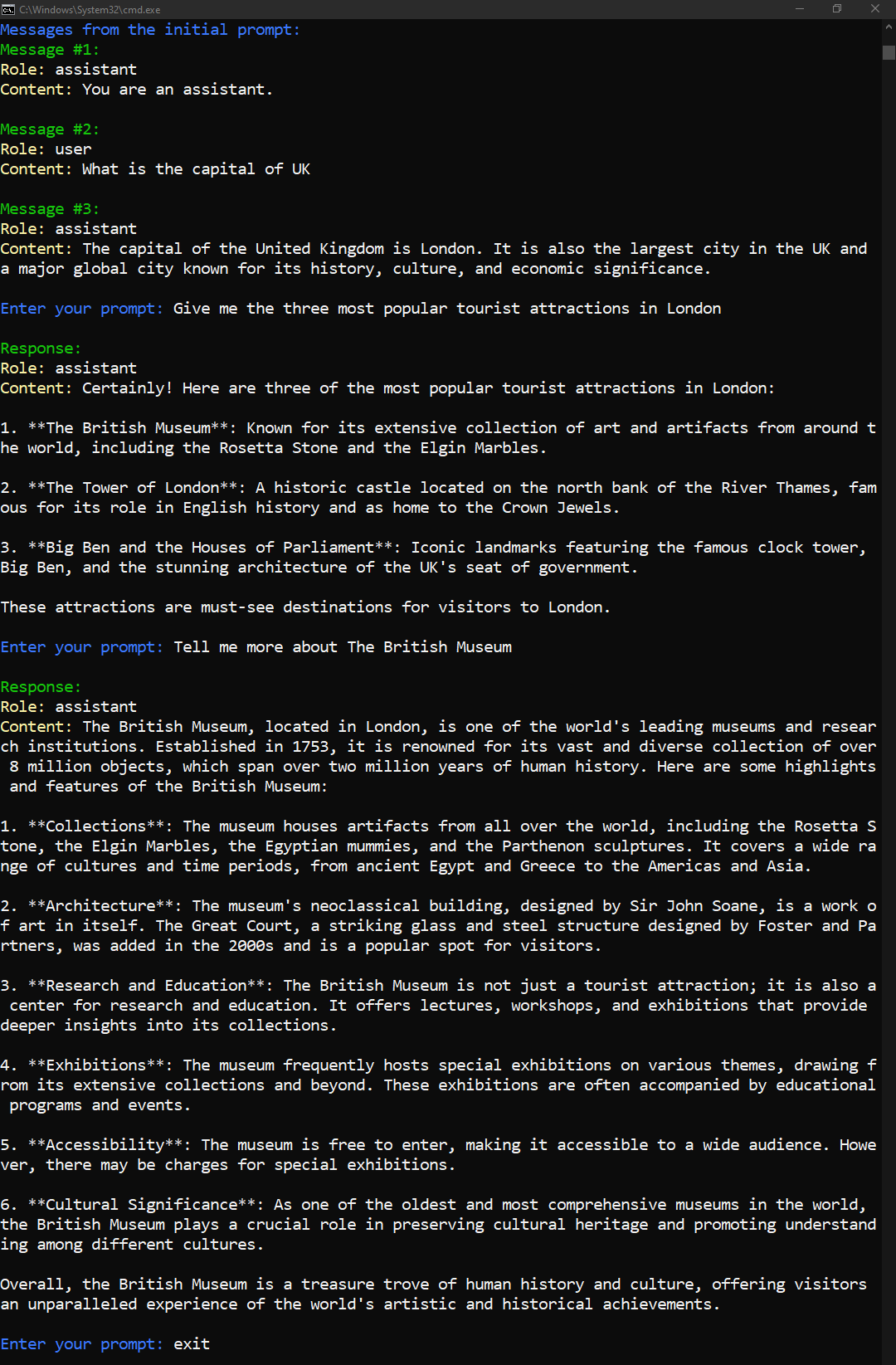 Messages from the initial prompt: Message #1: Role: assistant Content: You are an assistant. Message #2: Role: user Content: What is the capital of UK Message #3: Role: assistant Content: The capital of the United Kingdom is London. It is also the largest city in the UK and a major global city known for its history, culture, and economic significance. Enter your prompt: